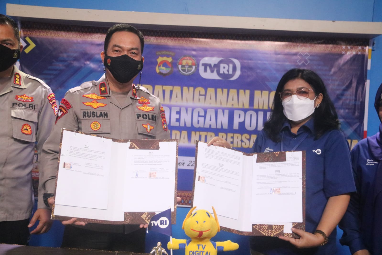 Penandatanganan berkas kerjasama antara Polda NTB dengan TVRI itu berlangsung di aula utama stasiun II TVRI NTB, Senin (22/9/2022).