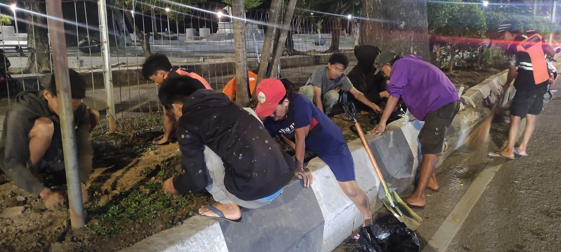 Terlihat Satgas kebersihan Kecamatan Tallo bersama 14 Satgas Kebersihan Kecamatan se Kota Makassar melakukan pembenahan taman di sekitar Anjungan Losari, Jalan Penghibur Kota Makassar