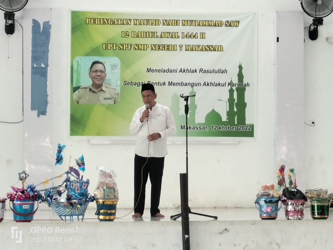 Menurut, Kepala UPT SPF SMP Negeri 7 Makassar Muh. Nasir dalam sambutannya menyampaikan, Maulid Nabi dapat dijadikan momentum untuk mengingat kembali kisah perjuangan Rasul. Dari kisah kisah itu, kita semua diharapkan dapat meneladani akhlak Nabi, baik dari segi keilmuan maupun budi pekertinya.