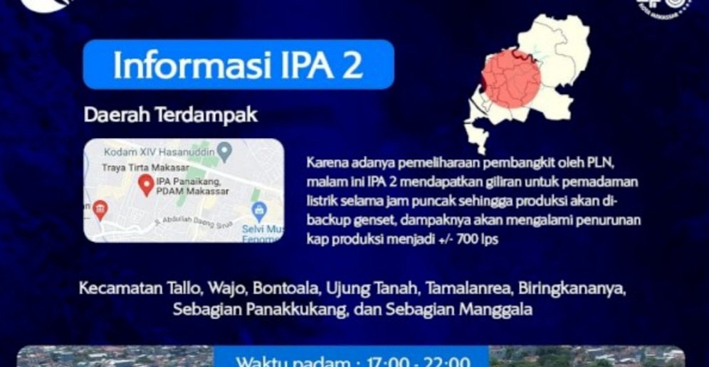“Karena adanya pemeliharaan pembangkit oleh PLN, malam ini IPA 2 dan IPA 4 mendapat giliran untuk pemadaman listrik selama jam puncak. Sehingga produksi akan di-backup genset, yang dampaknya akan mengalami penurunan kapasitas produksi,” bunyi keterangan pers PDAM Makassar.