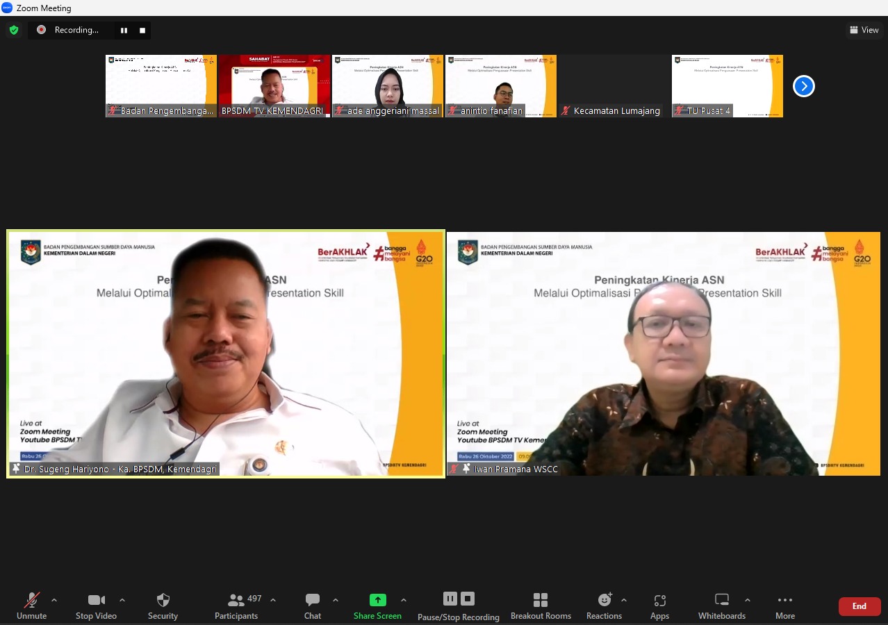 BN Online, Jakarta – Badan Pengembangan Sumber Daya Manusia (BPSDM) Kementerian Dalam Negeri (Kemendagri) menggelar Webinar Satu Hari Belajar Terintegrasi (SAHABAT), Rabu (26/10/2022). Webinar ini digelar untuk memberikan pelatihan tentang penguasaan keterampilan dalam presentasi bagi Aparatur Sipil Negara (ASN).
