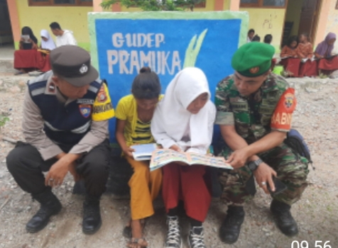 Giat go to school kerja bareng TNI Polri itu, dilakoni tanpa lelah dan penuh rasa cinta yang ditunjukan Aipda Nukrah, saat menyambangi SDN Pasir Putih Bajo Pulau Sape.