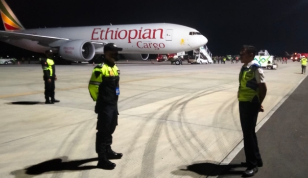 Pada pukul 01.25 wita, Pesawat Type B777-209F No. Reg ET-APS Rute JIB – LOP – HKG yang membawa logistik WSBK tahap II landing di Bizam.