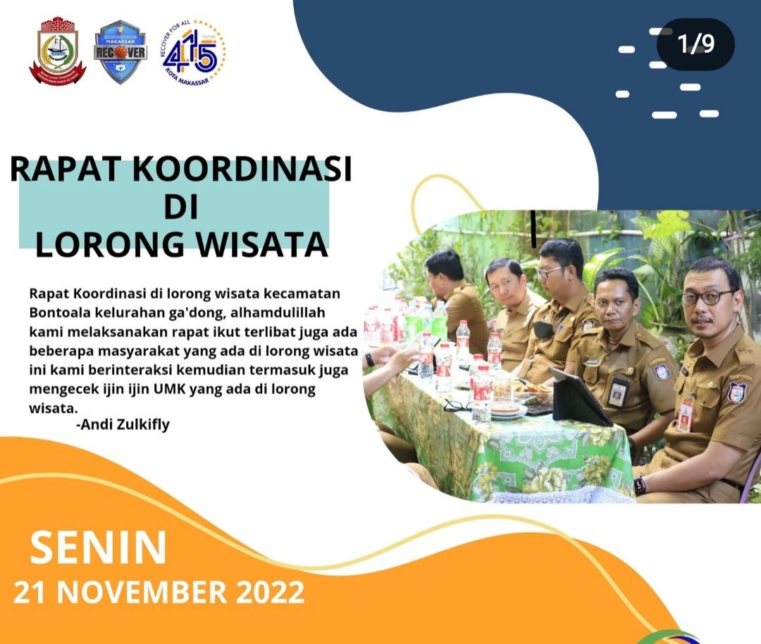 Rapat koordinasi ini dilakukan dengan melibatkan pemeeintah setempat, lurah gaddong dan LPM Kelurahan Gaddong serta pelaku usaha di lorong wisata dimana persediaan makan dan minum rapat diambil dari produk UMKM di lorong wisata itu.