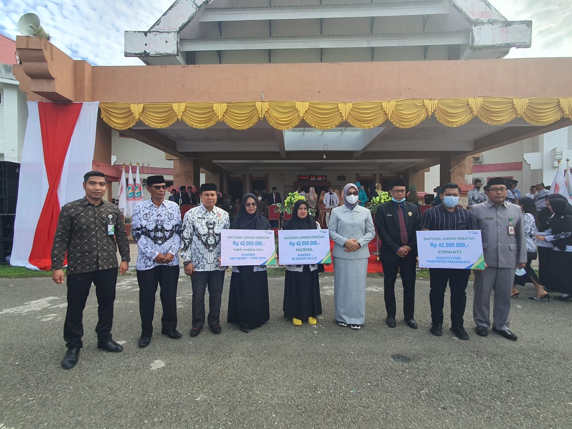 BN Online, Pasangkayu – Menjaga komitmen dan menampilkan pelayanan yang profesional melayani konsumennya, BPJS Ketenagakerjaan Cabang Mamuju Utara, Kabupaten Pasangkayu, Provinsi Sulawesi Barat (Sulbar), menyerahkan santunan Jaminan Kematian (JKM) dengan total 126 juta ke pada 3 orang ahli waris yang masing – masing mendapat 42 juta pada upacara apel Hari Guru Nasional (HGN) Tahun 2022.