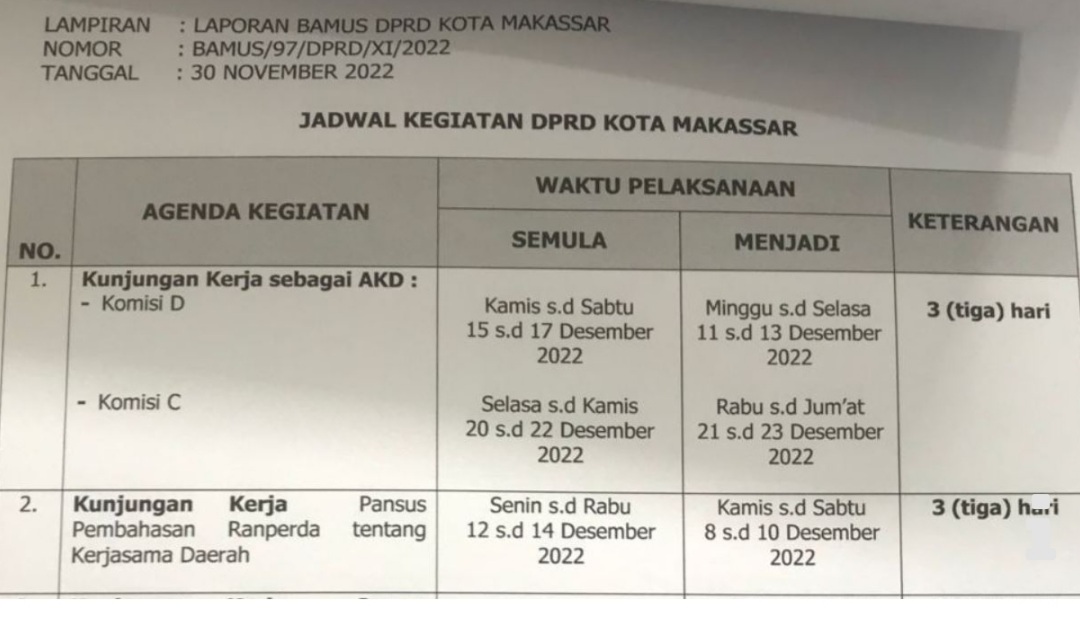 Dilansir dari website resmi DPRD Makassar, Senin (5/12/2022), berikut agenda para DPRD selama bulan Desember; kunjungan kerja sebagai AKD Komisi C 11-13 Desember 2022 dan Komisi D 21-23 Desember 2022, kunjungan Kerja Pansus Pembahasan Ranperda tentang Kerjasama Daerah 8-10 Desember 2022, Kunjungan Kerja Pansus Pembahasan Ranperda tentang Pengelolaan Lahan Pangan Pertanian Berkelanjutan 11-13 Desember 2022.