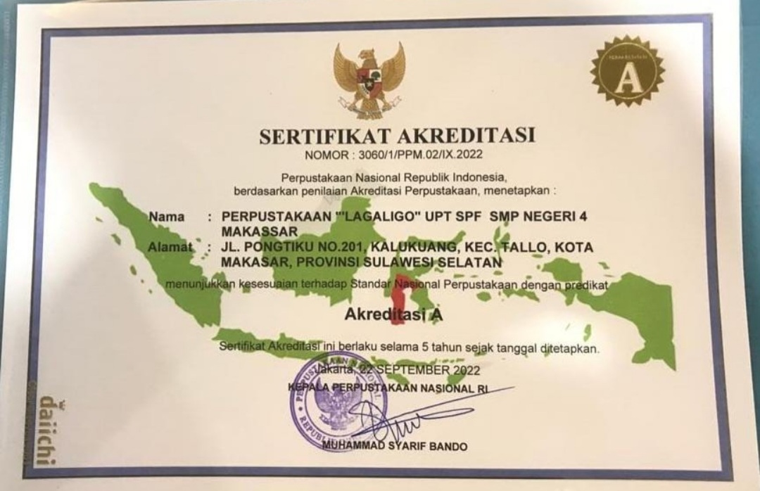 Dijelaskan, sertifikat akreditasi yang ditandatangani oleh Kepala Dinas Aesip Dan Perpustakaan Kota Makassar.Perolehan sertifikat tersebut merupakan kebanggaan tersendiri karena dari sekian banyak SMP di Kota Makassar, sekolah ini raih pengharagaan piagam Sertifikat Perpustakaan ” Lagaligo” kota