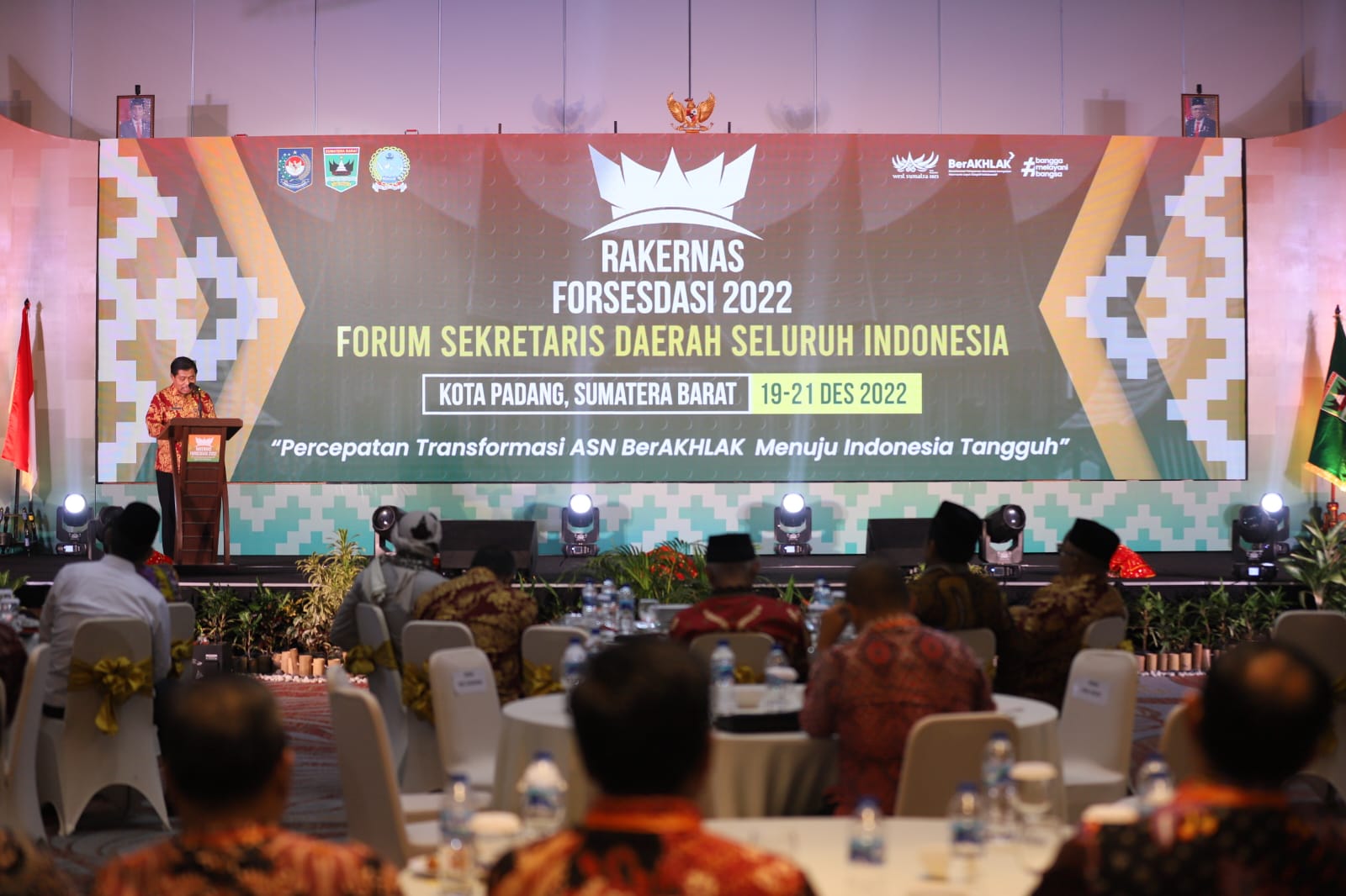Hal itu disampaikan Sekretaris Jenderal (Sekjen) Kemendagri Suhajar Diantoro dalam Rapat Kerja Nasional (Rakernas) Forum Sekretaris Daerah Seluruh Indonesia (Forsesdasi) 2022. Kegiatan yang berlangsung di Santika Premiere Hotel, Kota Padang, Sumatera Barat, Senin (19/12/2022), itu mengusung tema “Percepatan Transformasi ASN BerAKHLAK Menuju Indonesia Tangguh.”