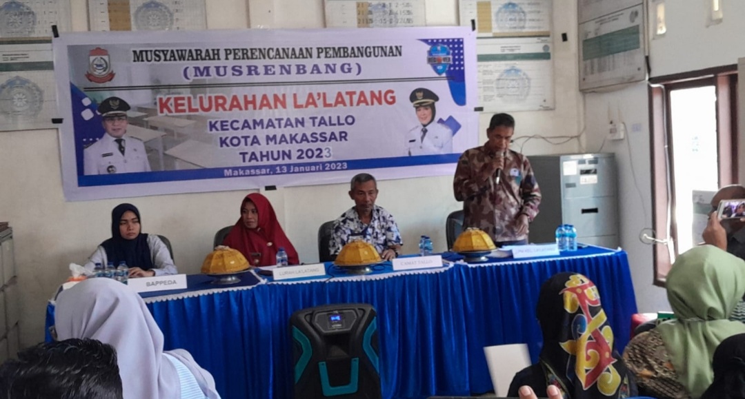 Dalam kegiatan Musrenbang Tahun 2023 dihadiri oleh Sekcam Tallo, Perawakilan Bappeda, Perwakilan Dinas PU, Perwakilan Dinas Sosial, Perwakilan Dinas Kesehatan, Puskesmas UPB, Perwakilan Dishub, Perwakilan Dinas Pendidikan, Perwakilan BPM, Penyuluhan KB, Sekretaris lurah, Ketua PJ LPM, Binmas La’latang, Babinsa Lalatang, Imam Kelurahan La’latang, Staf Kelurahan La’latang, Kader PKK, Tokoh Masyarakat, Ketua PJ RT RW se-Kelurahan La’latang.