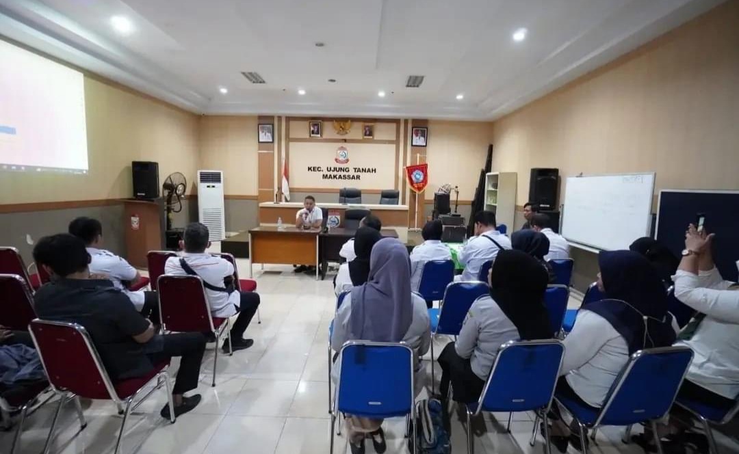 BN Online, Makassar—Sekcam Ujung Tanah Amanda Syahwaldi, S.STP., M.M. di dampingi kasi Kebersihan Abd. Haris,.Sos memimpin rapat koordinasi mengenai Aplikasi retribusi sampah bersama Lurah se-Kecamatan Ujung Tanah dan kolektor sampah Kelurahan di aula kantor Camat Ujung Tanah, Rabu 18 Januari 2023.