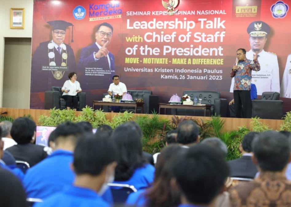 “Semua tentang kepemimpinan ialah harus berani seperti yang Pak Jenderal (Moeldoko) katakan, dan mulai dari diri sendiri karena pemimpin yang berhasil, disiplin terhadap dirinya maka selanjutnya bisa memimpin,” kata Danny di sela-sela acara di Universitas Kristen Indonesia (UKI) Paulus, Kamis, (26/1/2023).