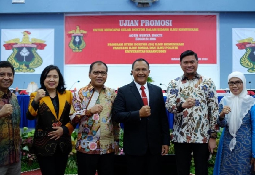 Diketahui, Letjen TNI (Purn) Agus Surya Bakti melalui disertasinya berhasil meraih nilai sangat memuaskan. Ia resmi menyandang gelar Doktor dalam Bidang Ilmu Komunikasi Unhas. Ujian promosi doktor ini menghadirkan penguji eksternal Menteri Dalam Negeri RI Tito Karnavian.