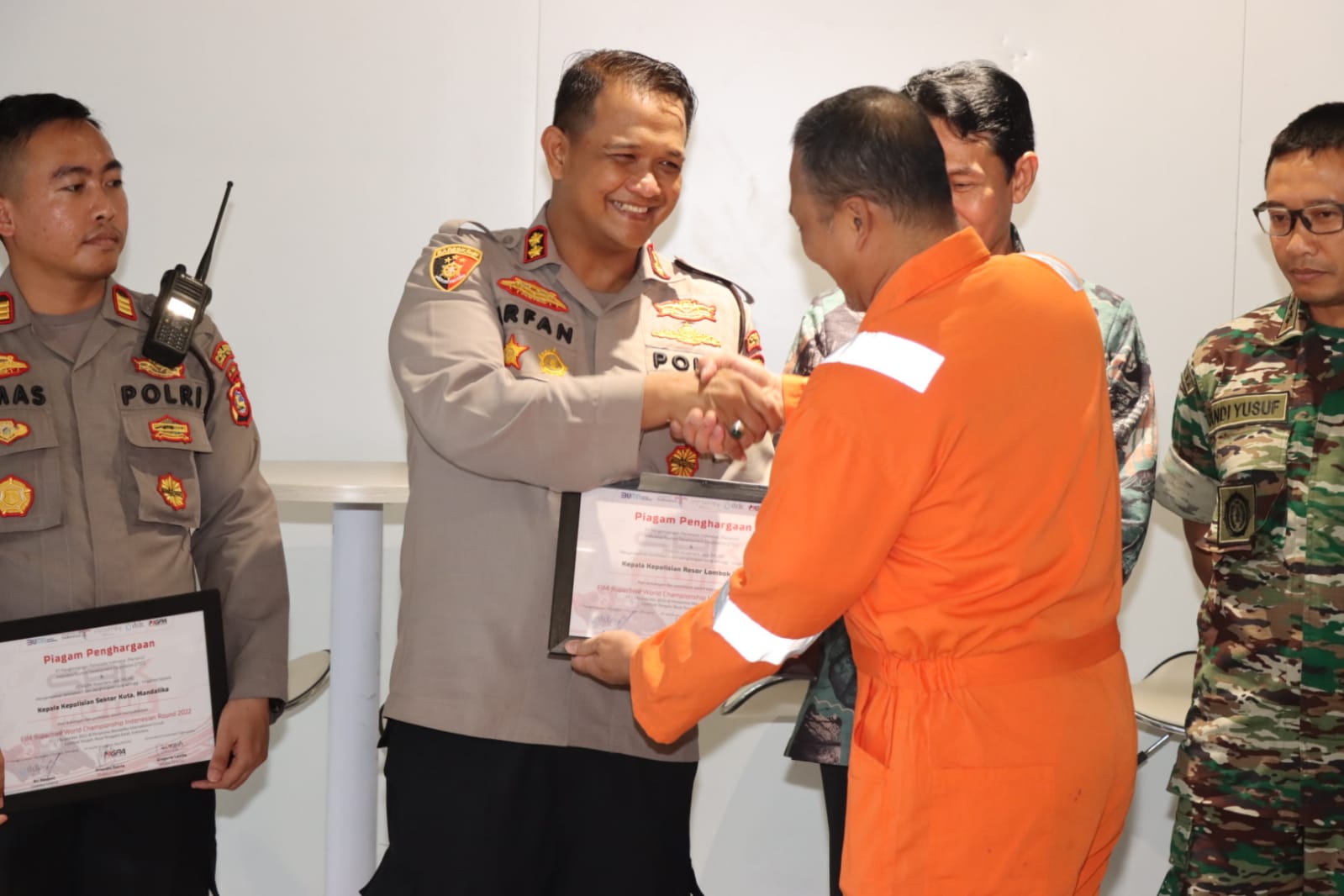 Kegiatan dilanjutkan dengan penyerahan sertifikat apresiasi dalam mensukseskan gelaran event WSBK tahun 2022 kepada Kapolda NTB, Danrem 162 WB, Sekda Provinsi NTB, Kepala Dinas Parawisata Provinsi NTB, Kadis Pora NTB, Kadis Koperasi dan UMKM Provinsi NTB, Kadis komunikasi Informatika dan statistik Provinsi NTB, Kadis Perhubungan Provinsi NTB, Kapolres Loteng, Dandim 1620 Loteng, Wakil Bupati Loteng, Sekda Kabupaten Lombok Tengah, Kepala Bapeda Kab. Loteng, Kadis Koperasi dan UMKM Kab. Loteng, Kapolsek Kawasan Mandalika, Ketua IMI NTB, Kadis Pariwisata Kab. Loteng dan Kadis Pendidikan Kab. Loteng.