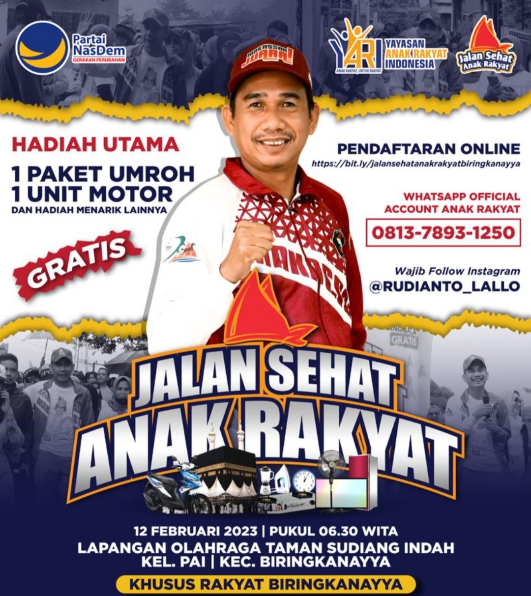 Jalan sehat anak rakyat ini akan turut dihadiri Ketua DPRD Makassar, Rudianto Lallo yang juga merupakan founder Yayasan Anak Rakyat Indonesia. Panitia telah menyiapkan satu paket umroh dan satu sepeda motor sebagai hadiah utama.