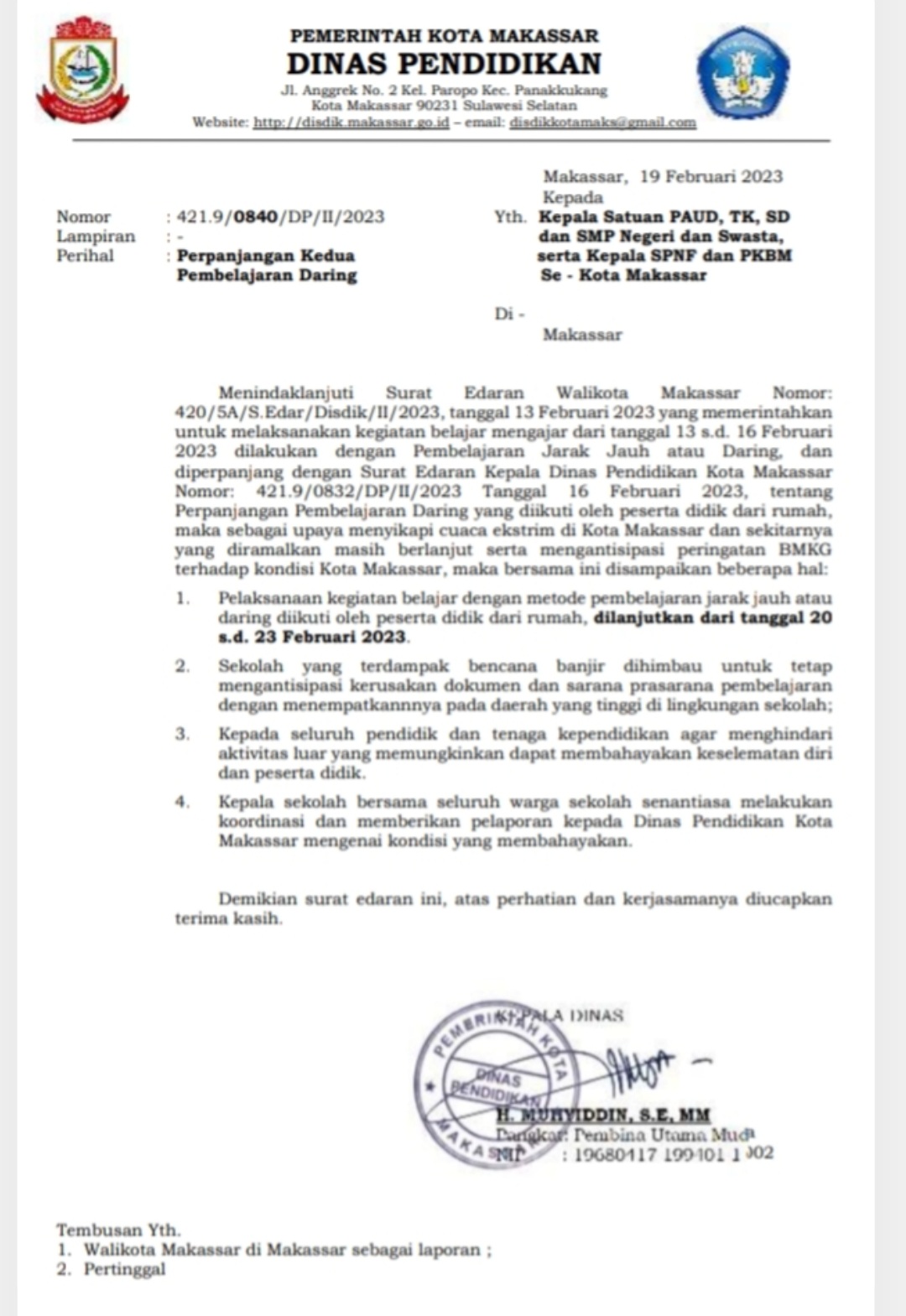 Menindaklanjuti surat edaran Walikota Makassar, Danny Pomanto, tanggal 16 Februari 2023 yang memerintahkan kegiatan belajar mengajar di Kota Makassar di laksanakan melalui jarak jauh atau daring.