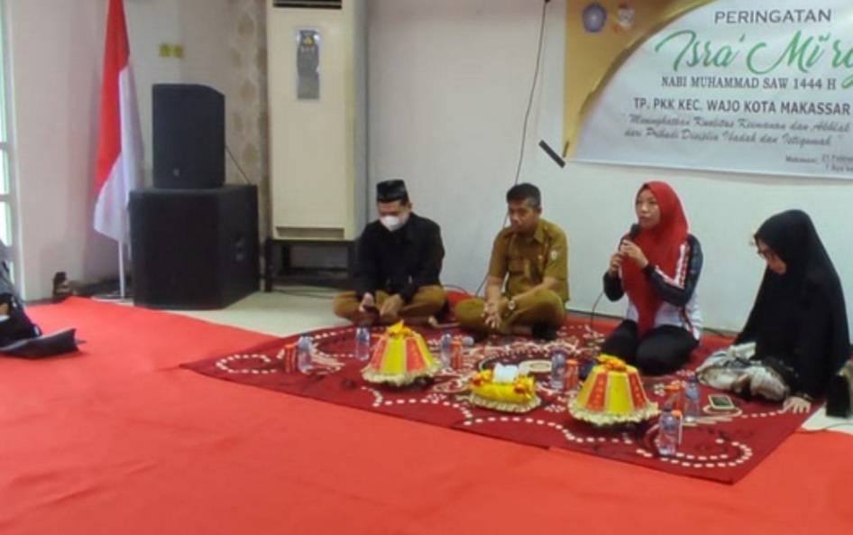 BN Online, Makassar—Camat Wajo, Hj Hamna Faisal ST, MM, menghadiri acara peringatan Isra Mi’raj Nabi Muhammad SAW 1444 H yang dilaksanakan TP PKK Kecamatan Wajo di aula Kantor Camat Wajo, Selasa (21/2/2023).