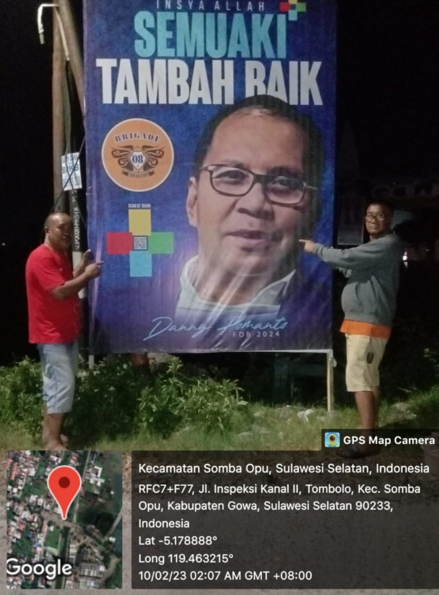 Baliho itu bergambar foto Mohammad Ramdhan ‘Danny’ Pomanto, disamping itu ada logo Brigade 08 dengan tulisan berukuran besar “Insya Allah SEMUAKI TAMBAH BAIK” dan Danny Pomanto For 2024.