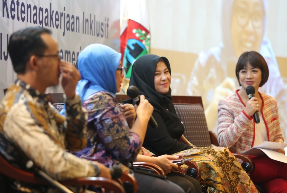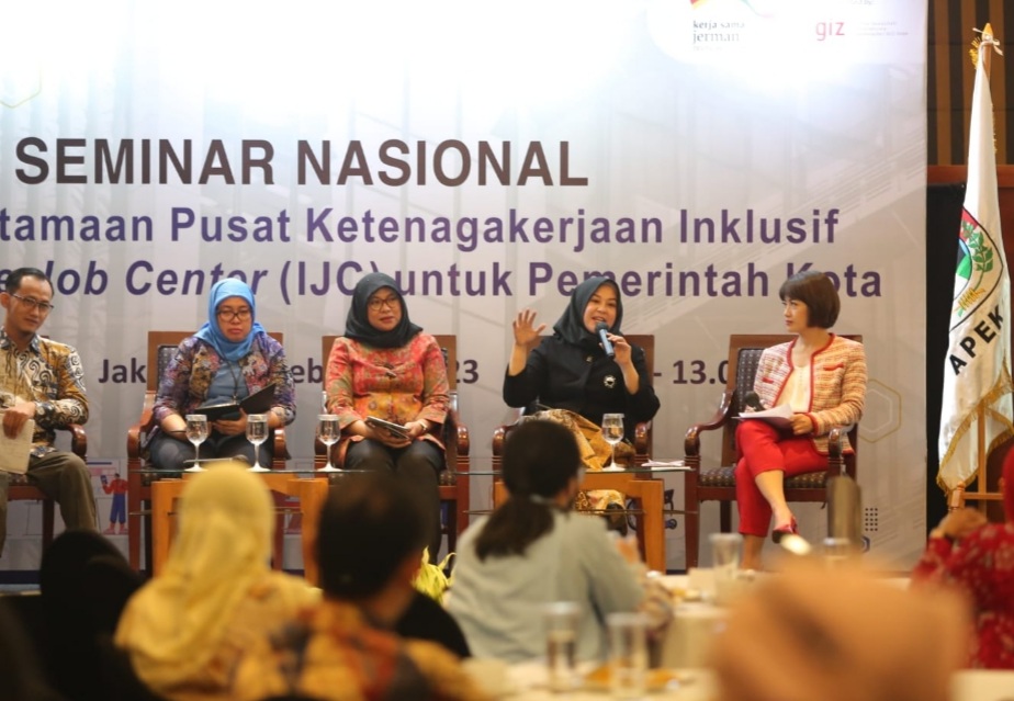 Mereka berdialog membahas tentang Kebijakan dan Inovasi Ketenagakerjaan Inklusif. Seminar Nasional ini diadakan Asosiasi Pemerintah Kota Seluruh Indonesia (APEKSI) bekerja sama GIZ perusahaan internasional milik federal Jerman.