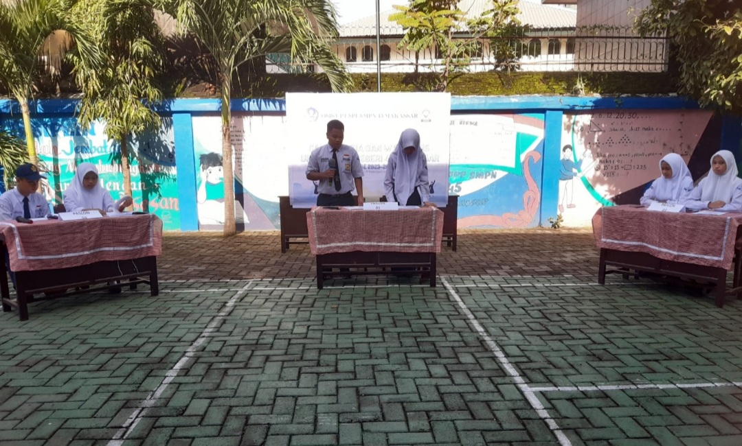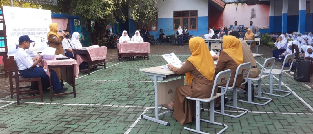 Kegiatan debat digelar sebagai salah satu rangkaian kegiatan sebelum dilakukan pemilihan pengurus OSIS. Melalui sambutan sekaligus untuk membuka kegiatan, Kepala UPT SPF SMPN 45 Makassar, Hj. Hamriah, S.Pd., M.M.Pd., menyatakan harapannya agar para peserta didik mengenal lebih jauh siapakah sosok yang paling tepat untuk dipilih menjadi pengurus OSIS.