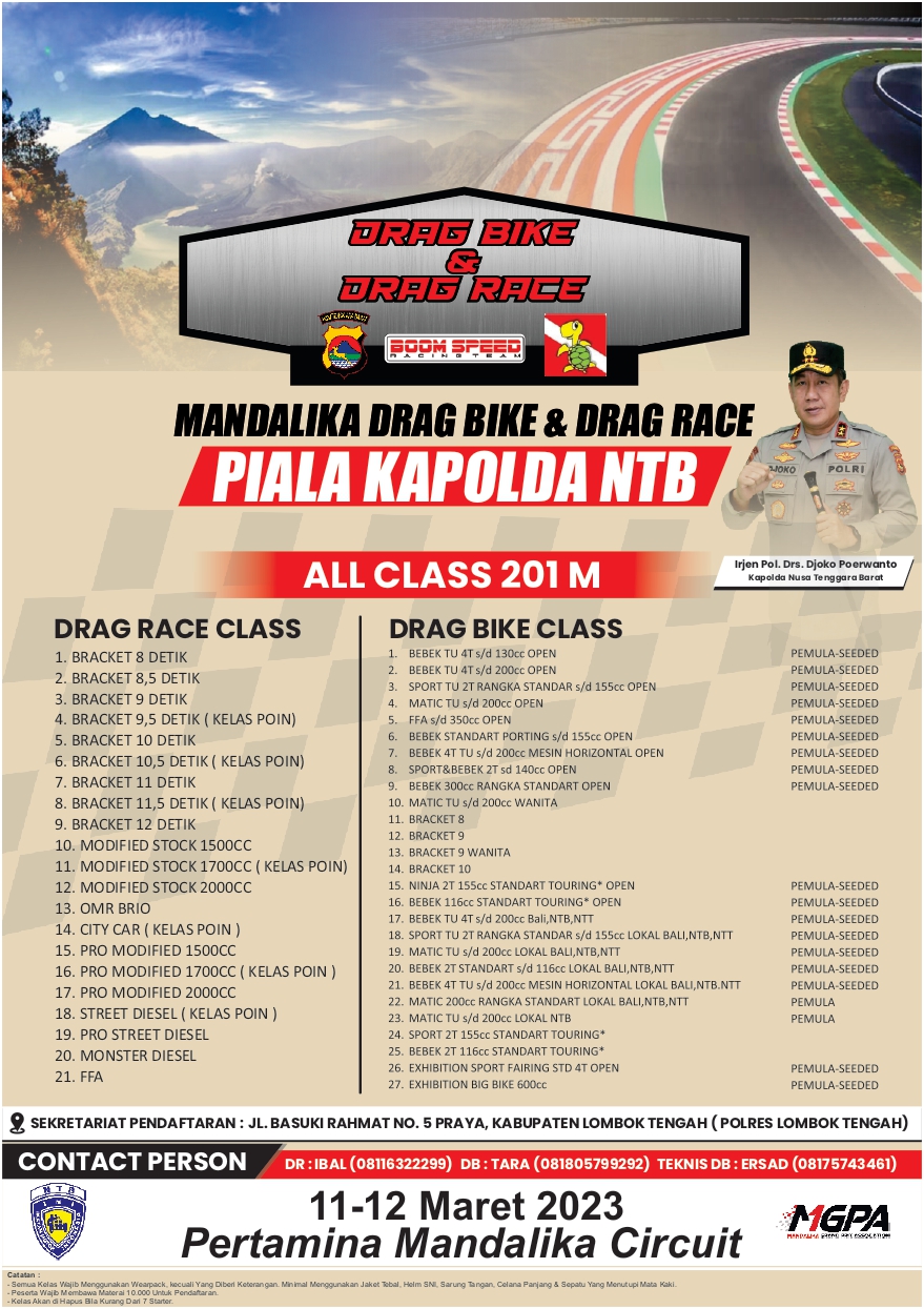 Untuk informasi dan pendaftaran, dapat menghubungi panitia pendaftaran : Drag Bike (IBAL) 08116322299 dan Drag Race (TARA) 081805799292 atau mendatangi Sekertariat Panitia Pendaftaran di Mako Polres Lombok Tengah.(BN 02)
