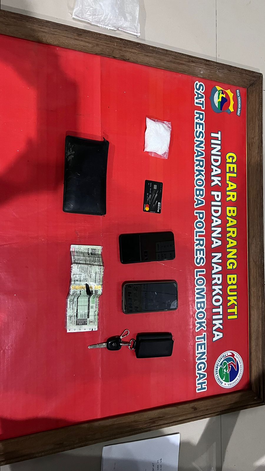 Untuk lokasi penangkapan di Kecamatan Praya Barat petugas juga dapat mengamankan barang bukti lainnya seperti satu unit mobil Daihatsu Grandmax Pick Up DR 8056 FZ, STNK Daihatsu Pick Up DK 8526 GE, uang tunai sejumlah Rp. 1.205.000,- empat unit HP merk Vivo, Redmi, Samsung dan Strawberry serta dompet, 53 poket plastik klip transparan siap isi, skop, gunting dan pipa kaca.