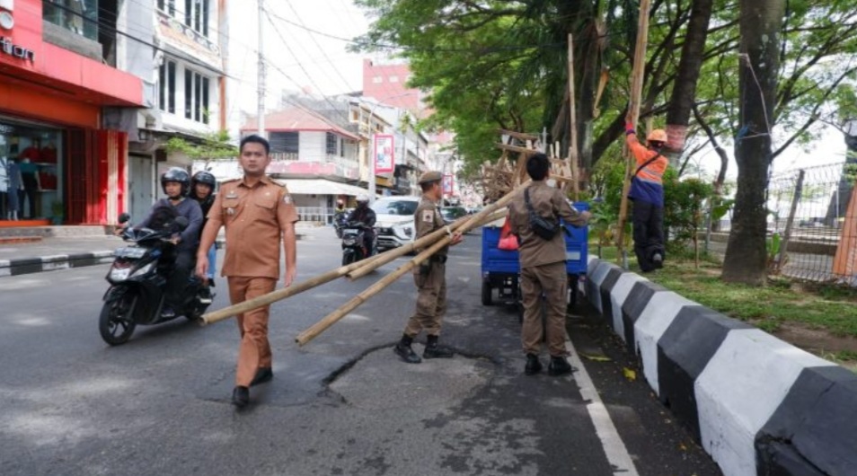 “Mengaggu keindahan kota, sore ini kami menertibkan bambu bambu yang ditinggalkan oleh pemiliknya begitu saja usai mereka berjualan,”tutur Syahrial