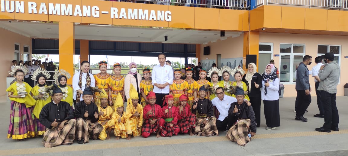 BN Online Makassar – Siswa-Siswi SDN Mangkura 2 antusias dengan menggunakan busana adat sambut kedatangan Presiden Republik Indonesia, Joko Widodo, di Stasiun Kereta Api Rammang-Rammang Kabupaten Maros, Provinsi Sulsel Rabu (29/3/2023).