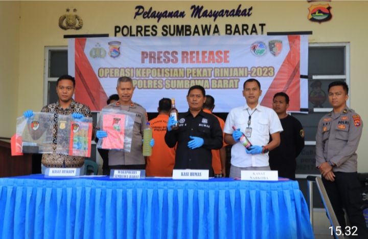 Polres Sumbawa Barat menggelar konferensi pers pada jumat (31/3/23),dari hasil operasi Pekat Rinjani 2023 yang dipimpin langsung oleh Wakapolres Kompol Jamaluddin, S.Sos dengan didampingi Kasat Reskrim AKP Hilmi M Prayugo,S.IK,Kasat Narkoba AKP M Fatoni, SH dan Kasi Humas IPDA Eddy Soebandi, S.Sos.Bertempat di Gedung Pelayanan Masyarakat Polres Sumbawa Barat.