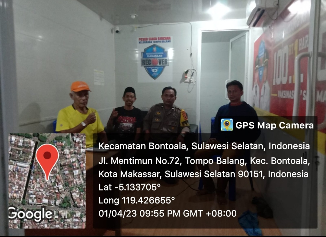 BN Online, Makassar— Sesuai arahan Wali Kota Makassar terkait mengaktifkan Recover Center di Kelurahan masing-masing sebagai posko siaga bencana dan Multifungsi serta Atas petunjuk dan arahan Camat Bontoala Bapak Arman Nurdin, S. Sos. M. Si dan Sekcam Bontoala Bapak Manggala Putra, S. STP melakukan Posko Setiap Saat Seperti terlihat Sabtu, (01/04/2023) Malam.