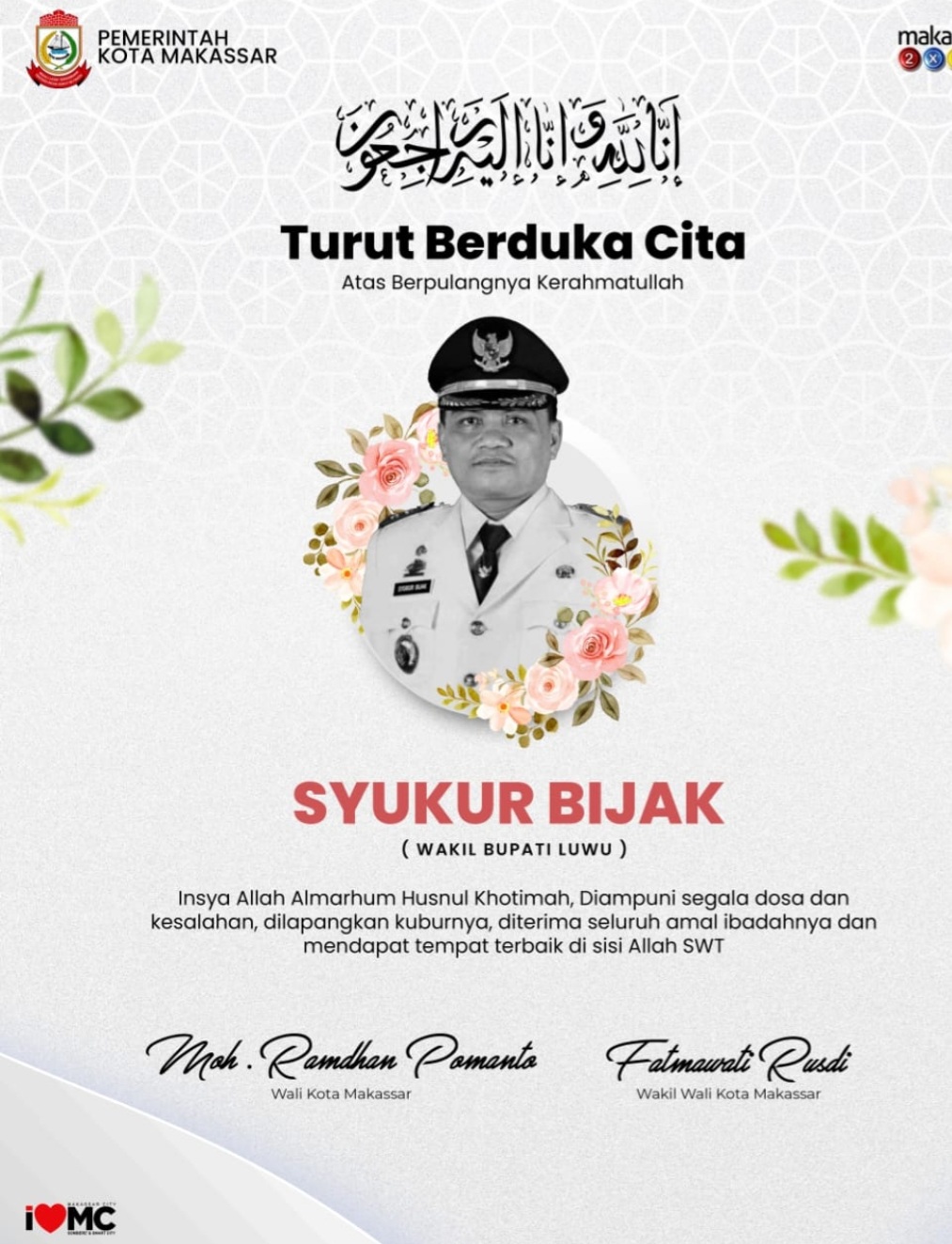 BN Online, Makassar-–Wali Kota Makassar Moh Ramdhan Pomanto mewakili Pemkot Makassar dan masyarakat Kota Makassar menyampaikan rasa duka yang mendalam atas meninggalnya Wakil Bupati Luwu, Syukur Bijak.