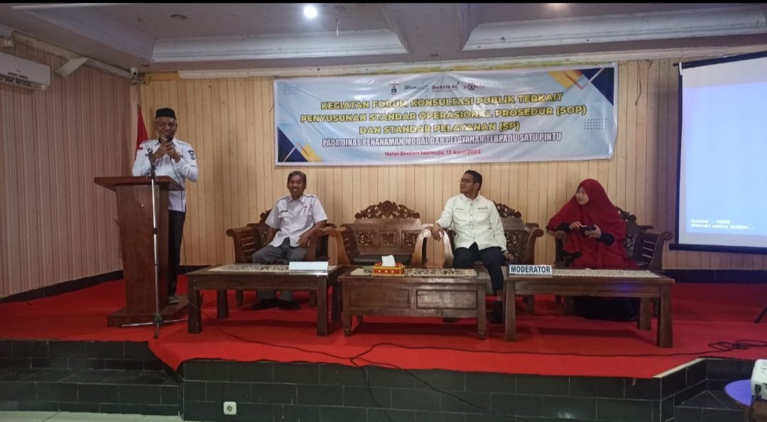 BN Onlime, Mamuju – Dinas Penanaman Modal dan Pelayanan Terpadu Satu Pintu (DPMPTSP) Sulawesi Barat melaksanakan kegiatan forum konsultasi publik terkait penyusunan standar operasional prosedur (SOP) dan standar pelayanan (SP) di Hotel Berkah Mamuju, Rabu , 12 April 2023