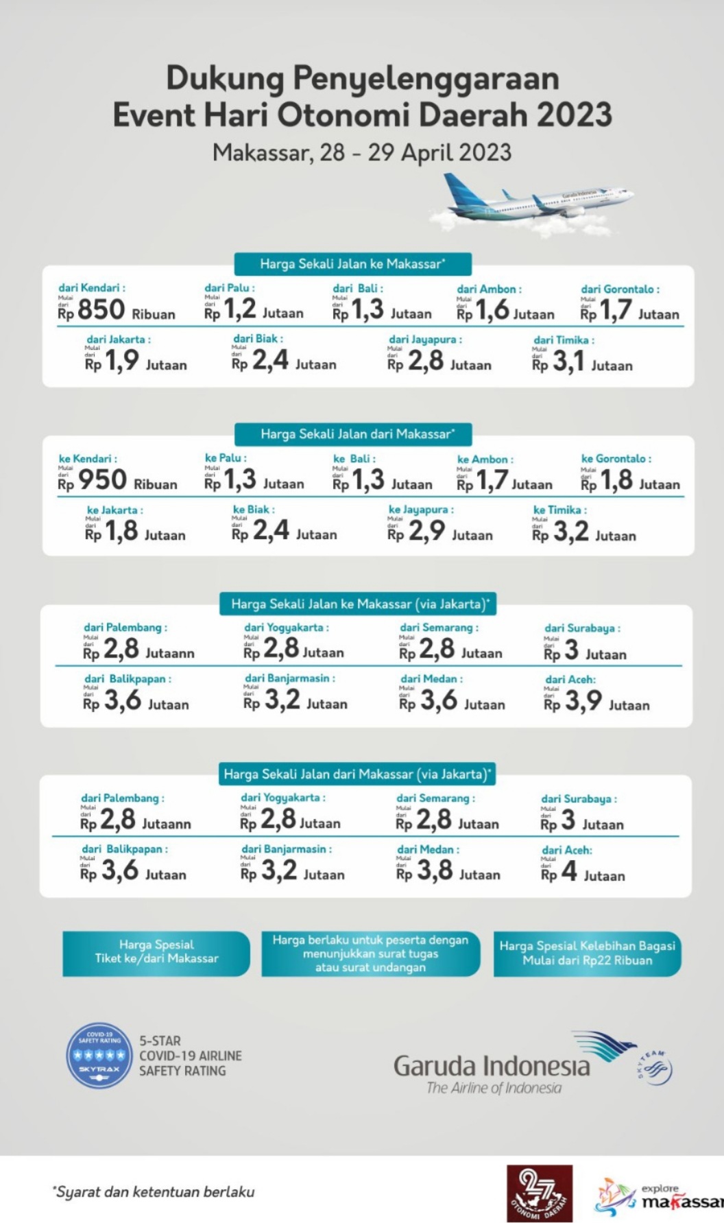 “Garuda Indonesia menyiapkan promo spesial sebagai wujud dukungan kesuksesan Hari OTDA 2023. Beberapa promo yang dipersiapkan adalah harga spesial penerbangan ke/dan dari Makassar dan harga spesial kelebihan bagasi mulai dari Rp22 ribu,” kata Nini, Minggu, (16/04/2023).