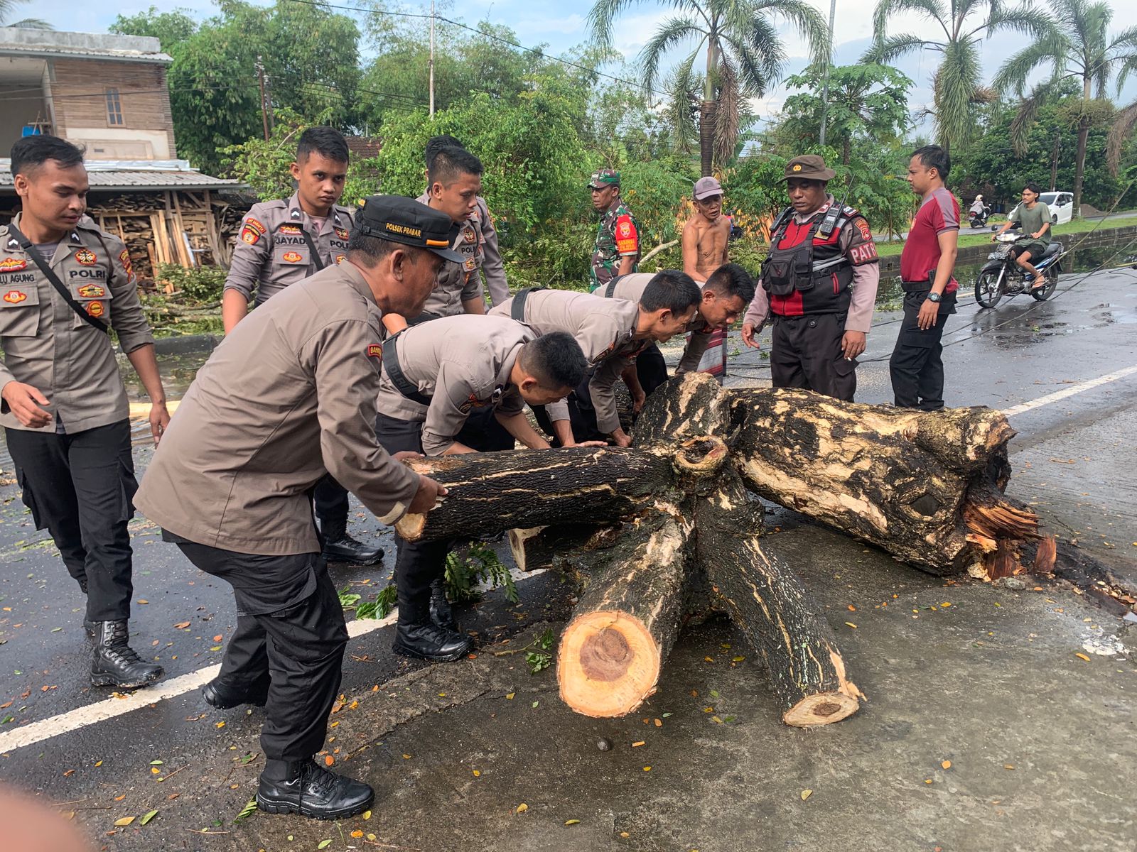 “Masyarakat sekitar juga ikut berpartisipasi ikut membantu melakukan evakuasi/pemotongan pohon yang tumbang tersebut” jelas Kapolsek.