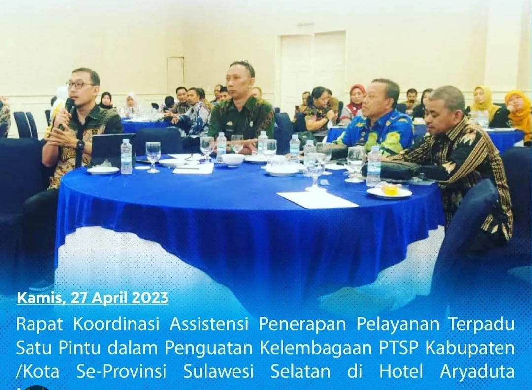 BN Online, Makassar—Kepala Dinas Penanaman Modal dan Pelayanan Terpadu Satu Pintu Kota Makassar Andi Zulkifly menghadiri rapat koordinasi asistensi penerapan pelayanan terpadu satu pintu dalam penguatan kelembagaan PTSP Kabupaten/Kota se-Provinsi Sulawesi Selatan bertempat di Hotel Aryaduta Makassar, Kamis (27/04/2023).
