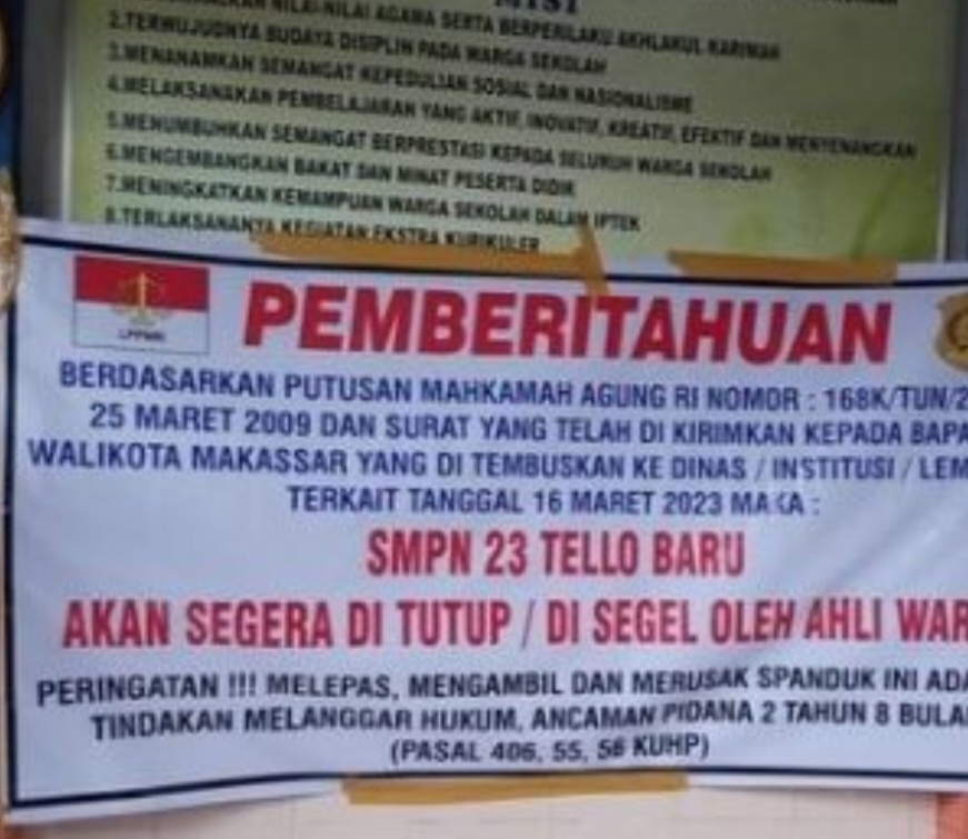 16. Bahwa Berdasarkan Isi Penjabaran dari Point nomor 1 s/d Point nomor 15 diatas, maka Dengan Segala Hormat Pihak Ahli Waris MEMOHON DENGAN SANGAT KEPADA SEMUA PIHAK, agar kiranya Tidak Mempersoalkan, Tidak Mempermasalahkan dan Tidak Menghalang – Halangi, apabila Ahli Waris Akan Segera Menyegel / Menutup Sekolah SMPN 23 Tello Baru Makassar, DALAM RANGKA MENUNTUT HAKNYA.