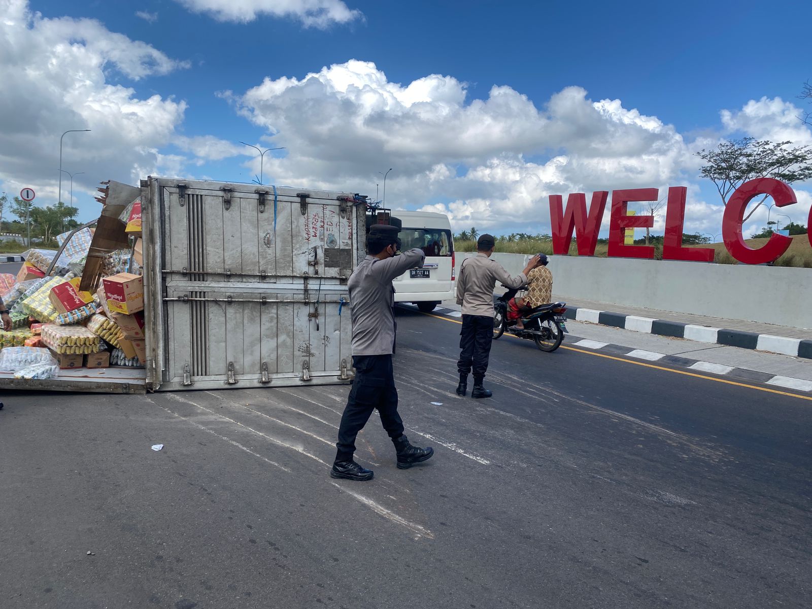 Bidik Nasional.id – LOMBOK TENGAH, NTB – Sebuah Mobil Truk box bermuatan snack dan minuman terguling di jalan raya Baypass Lombok Tengah, tepatnya di bundaran luar BIZAM Kabupaten Lombok Tengah pada Minggu 04/06/2023 sekitar pukul 11.00 wita.