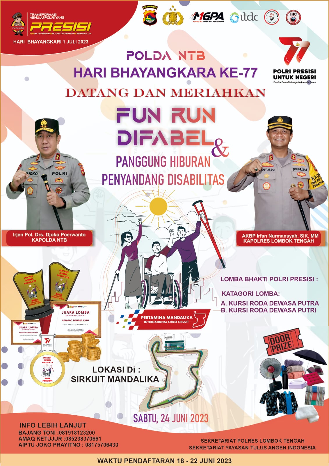 AKBP Irfan mengatakan kegiatan bertema ‘Fun Run Difabel Polda NTB 2023’ ini merupakan rangkaian Hari Bhayangkara Ke-77 tahun 2023 dan jadi salah satu bentuk bakti kepedulian Polri kepada penyandang disabilitas.