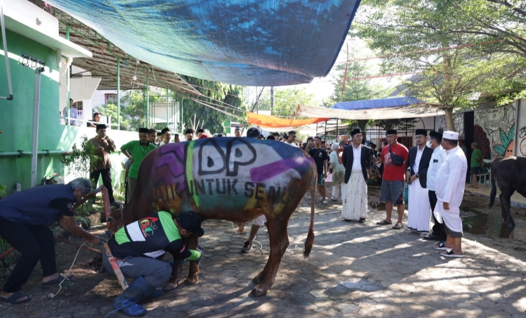 Danny Pomanto sapaan akrab Ramdhan Pomanto menyelenggarakan pemotongan hewan kurban di masjid Nur Al-aqsa dekat rumahnya.