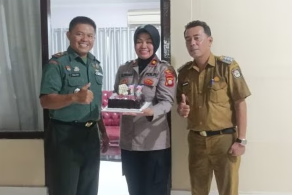 BN Online, Makassar– Mayor Inf Yulius S. Sos (Danramil Mariso) didampingi Juliaman, S. Sos (Camat Mariso) memberikan kejutan kepada Kapolsek Mariso Kompol Rizkiana, SH,.MM.dalam rangka memperingati HUT Bhayangkara ke – 77 tahun 2023.