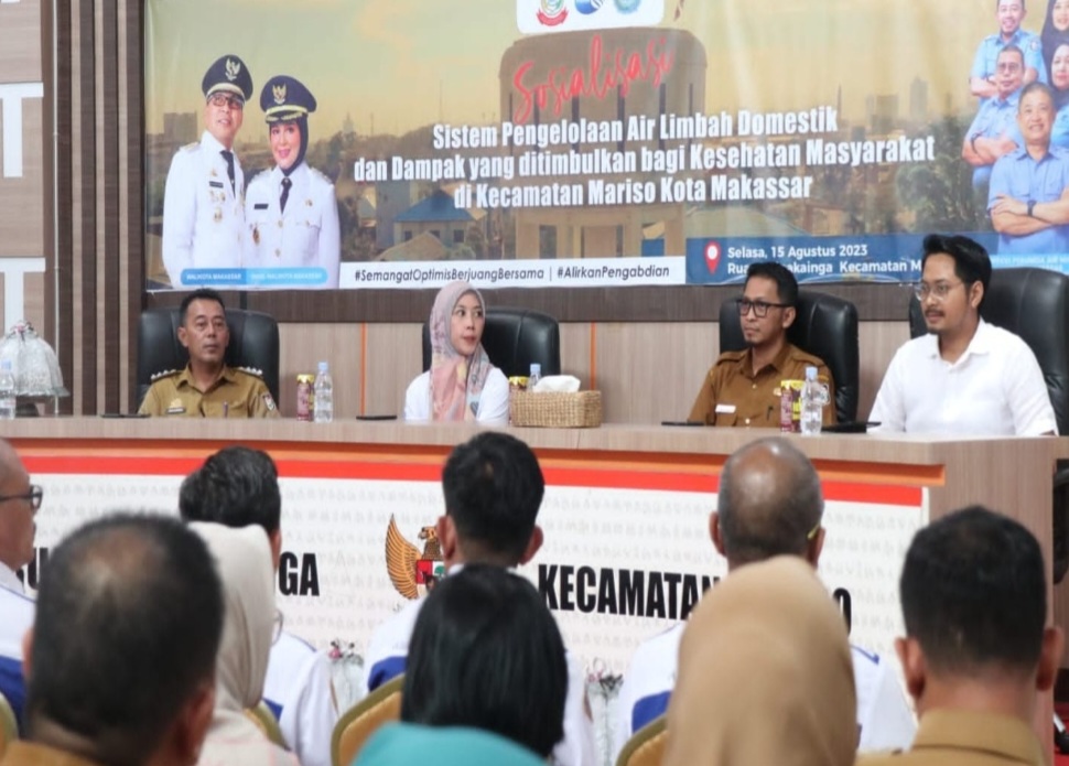 Terkait pengelolaan limbah domestik perumda air minum kota Makassar (PDAM) menggelar sosialisasi yang di buka langsung oleh direktur umum PDAM Indira Mulyasari di aula kantor kantor kecamatan Mariso, Selasa (15/08/2023).
