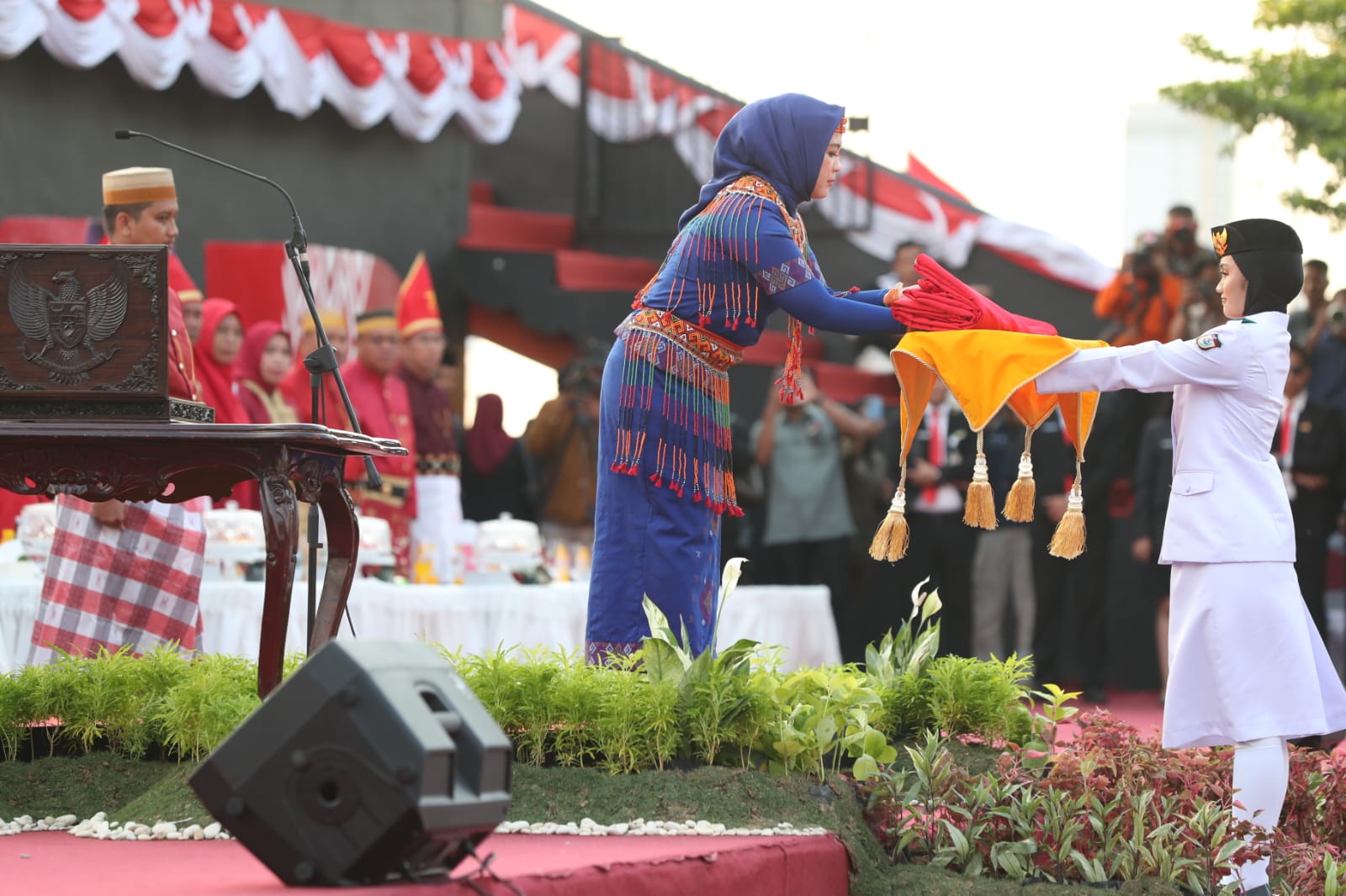 Selepas penurunan bendera, Fatmawati Rusdi menyampaikan apresiasi dan ucapan terima kasih kepada seluruh pasukan pengibaran dan penurunan bendera.