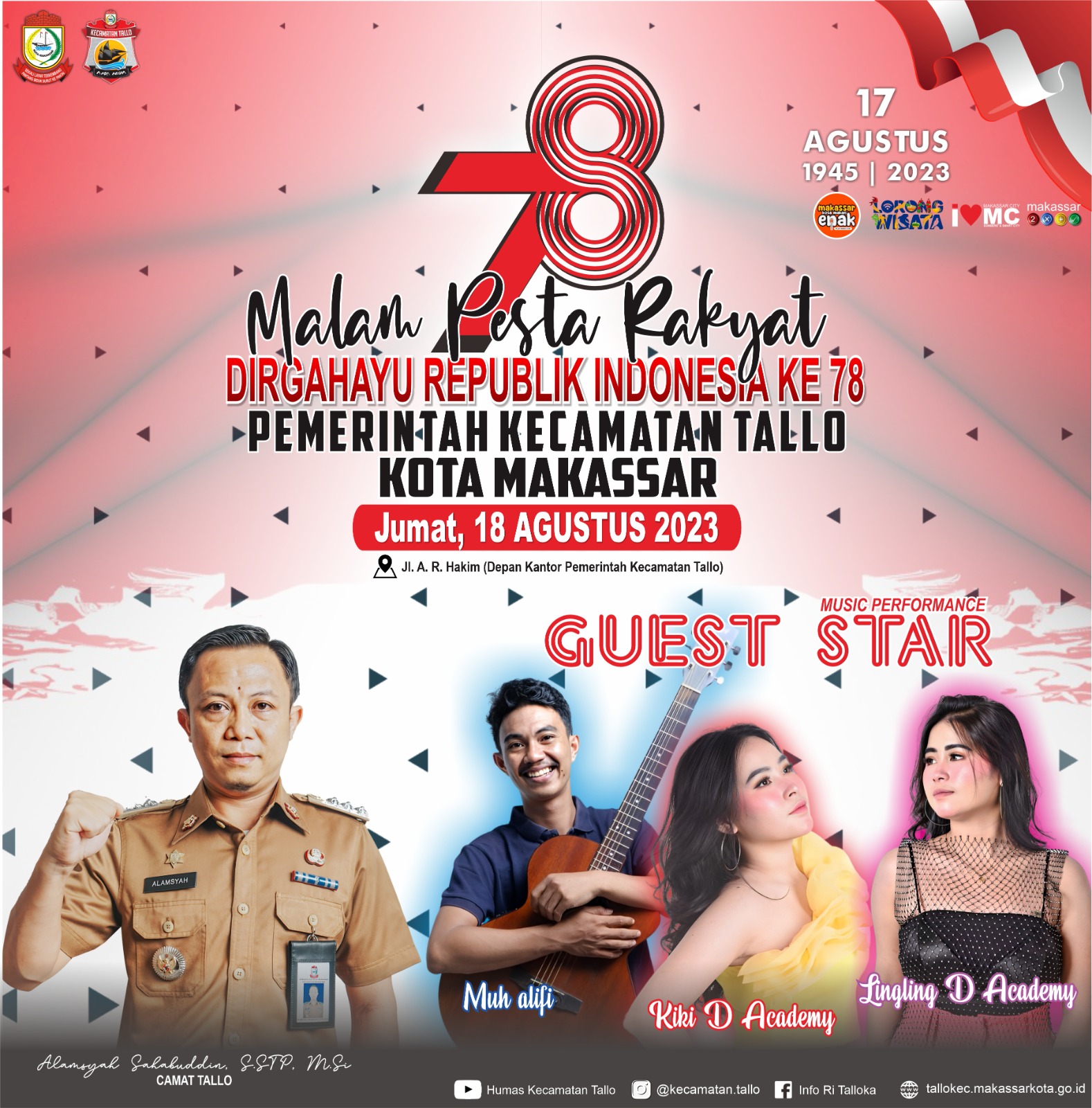 BN Online, Makassar—Perayaan Malam pesta Rakyat Hari Ulang Tahun Kemerdekaan Republik Indonesia ke 78 tahun, /2023 Tingkat Kecamatan Tallo bakal berlangsung dahsyat karena menghadirkan artis Jebolan Dangdut Akademi Kiki dan Lingling juga penyanyi muda berbakat asal Jeneponto Muh Alifi yang terkenal dengan kemampuan mencover lagu.