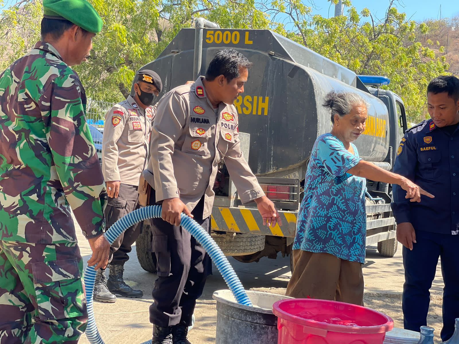 ” Dalam distribusi air bersih dihadiri langsung oleh Kapolsek kawasan pelabuhan laut Tano IPTU Nurlana,anggota Koramil 1628/04 Poto Tano,anggota Polsek KPL Tano,anggota Sat Samapta dan Koordinator BPTD Pelabuhan Poto Tano,” jelasnya