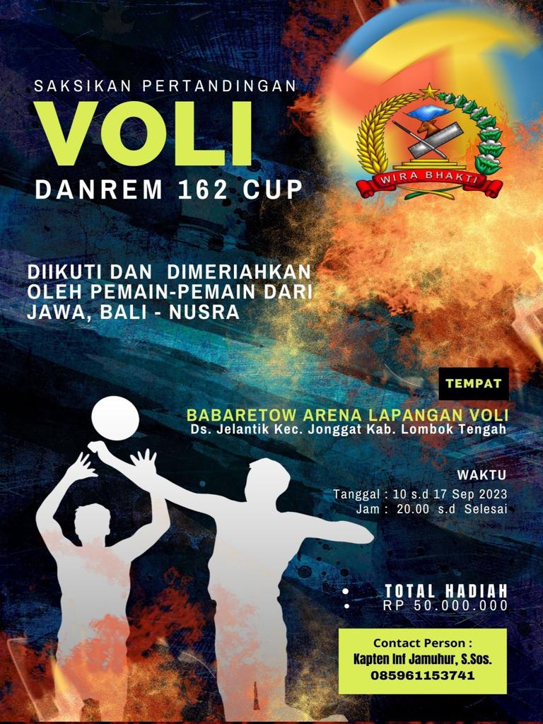 Menurut Ketua Panitia Dandim 1620 Loteng LETKOL KAV I F Andi Yusuf Kertanegara melalui Ketua Pelaksana Pertandingan Kapten INF Jamuhur S. Sos saat dihubungi Media Bidik Nasional Melalui Via WA , Pertandingan Volly Danrem 162 Cup tersebut akan diikuti dan dimeriahkan oleh Pemain Jawa – Bali – Nusra dengan Total Hadiah Lima Puluh Juta Rupiah ( 50.000.000)