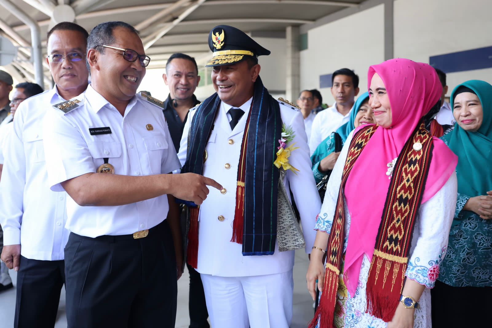 Di Bandara Internasional Sultan Hasanuddin, Danny Pomanto dan Pj Gubernur Sulsel Bahtiar saling rangkul dan berbincang santai.