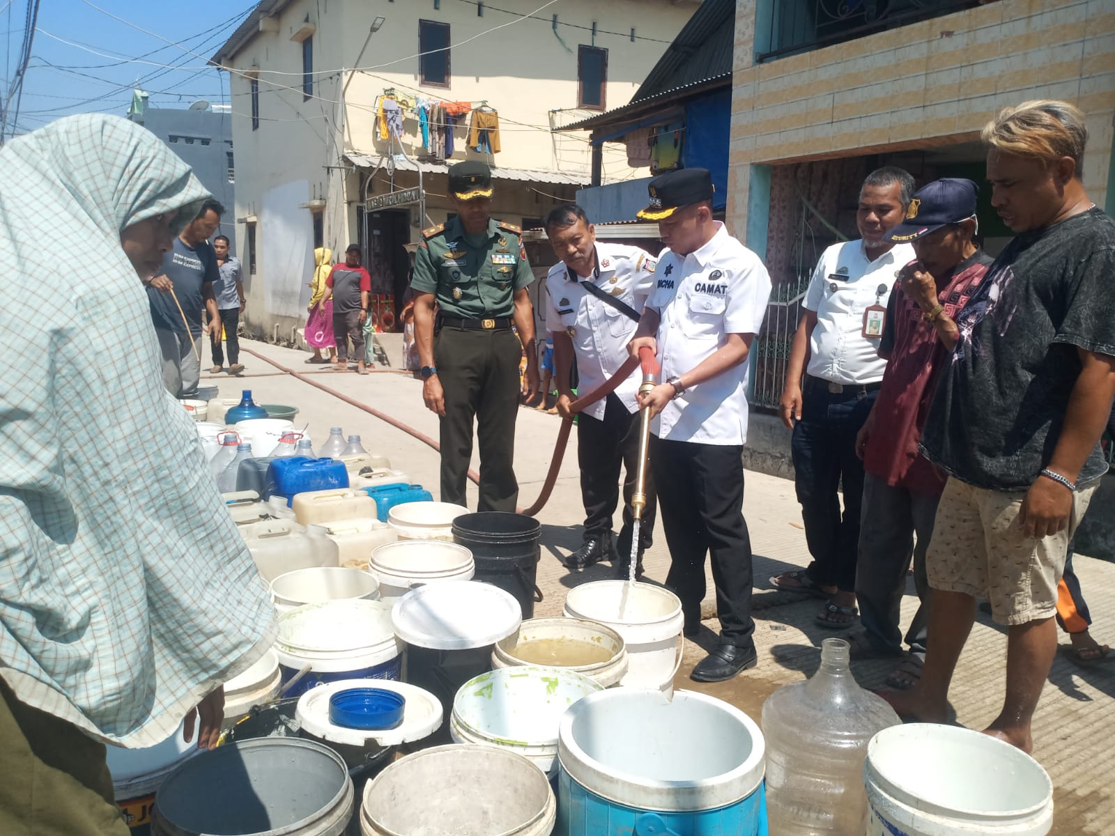 Ratusan warga berdatangan menenteng jerigen dan ember, ada juga yang menggunakan grobak, mereka terlihat bersemangat dengan ekpresi yang gembira, karena mendapatkan air bersih untuk memenuhi kebutuhan memasak dan minum sampai