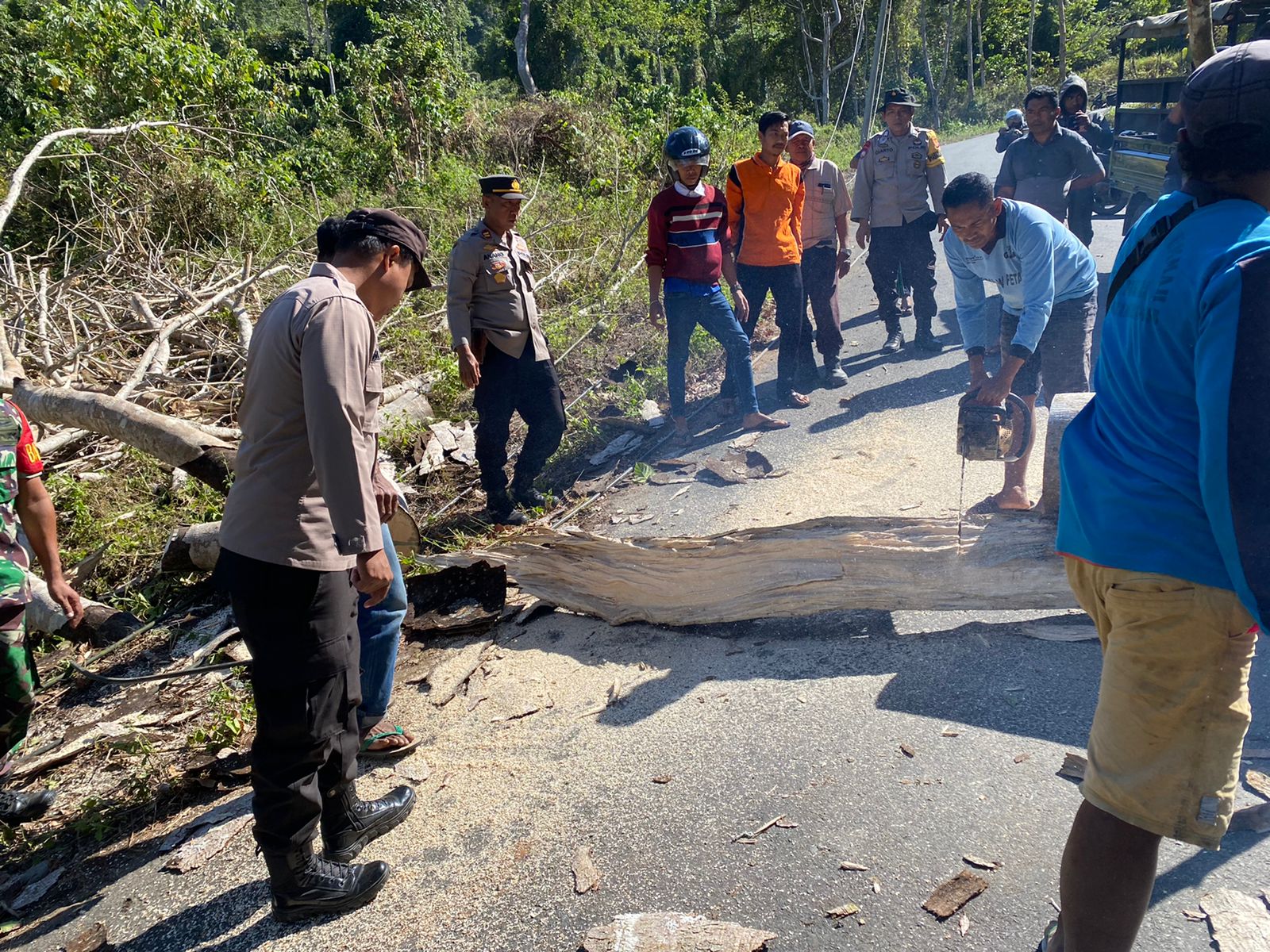 Bidik Nasional.id – Sumbawa Barat – Kepala Kepolisian sektor (Kapolsek) Brang Rea IPTU Anang Ma’ruf bersama anggota Polsek Brang Rea dan anggota Koramil Taliwang serta masyarakat setempat melaksanakan kegiatan penebangan dan pemindahan pohon yang tumbang di jalan menuju Desa Rarak Ronges Kecamatan Brang Rea, Kabupaten Sumbawa Barat.