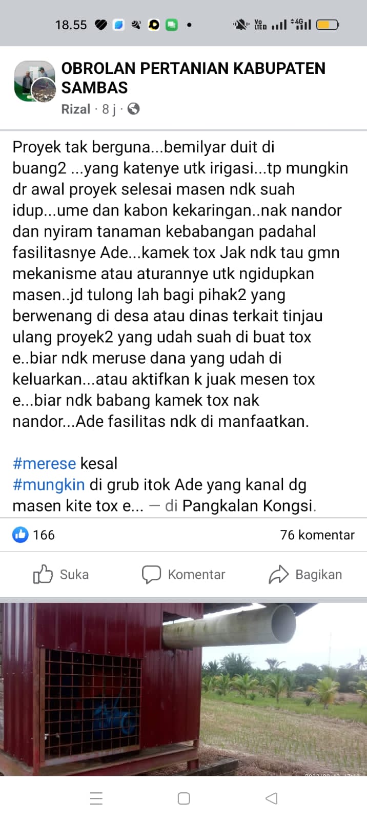 BN online,(Kalbar) Sambas- Kembali viral berkaitan dengan masalah pertanian yang terjadi di kabupaten Sambas, seperti yang beredar di media sosial grup Obrolan Pertanian Kabupaten Sambas dari nama akun FB @Rizal yang memfosting foto dan Statusnya dengan campuran logat daerah dan setelah diterjemahkan lebih kurang seperti ini,” Proyek tak berguna..bermilyar duit dibuang2..yang katanya untuk irigasi..tapi mungkin dari awal proyek selesai mesin tak pernah hidup..sawah dan kebun kekeringan..mau menanam dan nyiram tanaman menjadi kesusahan padahal fasilitasnya ada…kami ini tak tau gimana mekanisme atau aturan nya untuk menghidupkan mesin…jadi tolonglah bagi pihak pihak yang berwenang di desa atau dinas terkait tinjau ulang proyek proyek yang sudah pernah di buat ini..biar tak sia sia dana yang sudah dikeluarkan..atau aktifkan lah juga mesin ini…biar tak pusing kami ini mau menanam padi…ada fasilitas tak dimanfaatkan.