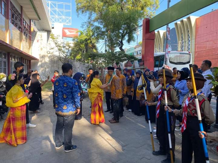 Eskul Pramuka memberikan penghormatan selanjutnya lagu Anging Mammiri oleh kelompok Drumband siswa memeriahkan proses penyambutan tersebut.