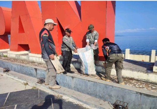 Puluhan anggota Satpol PP Sulbar bahu membahu membersihkan seluruh area Anjungan Pantai Manakarra, sampah kemudian dikumpulkan didalam karung dan kantong sampah untuk memudahkan petugas kebersihan mengangkut kedalam kendaraan sampah.